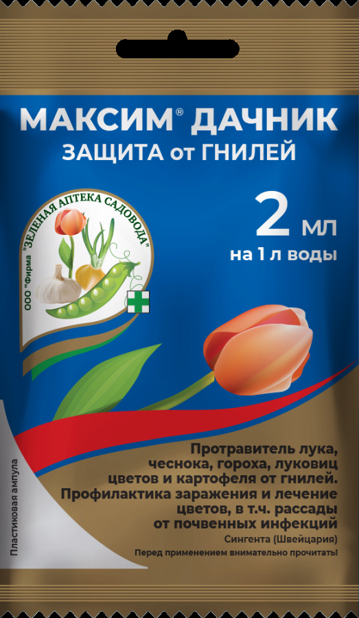 «Максим», средство защиты цветов и картофеля «Максим» — препарат защитно-контактного действия для защиты от болезней луковичных (тюльпаны, гладиолусы, лилии и т. д.), георгинов, пионов, корней и корневищ других цветов, а также семенного картофеля. Создает защитный барьер на поверхности посадочного материала и в прикорневой зоне в почве. Эффективен против всех видов гнилей, плесеней, фузариоза, ризоктониоза, парши и других заболеваний. Защищает растения от болезней в течение всего периода роста и хранения.
