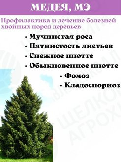 «МЕДЕЯ, МЭ» для хвойных пород деревьев 10 мл. Представлен в объеме: 10 мл. Средство для профилактики и лечения болезней хвойных и лиственных деревьев. Преимущества: • Быстро и продолжительно действует при любой погоде • Экономично расходуется и не выпадает в осадок • Безопасен для культуры. Действие: Быстро проникает в растение и останавливает заболевание на любой стадии его развития. Рекомендации по применению При благоприятных условиях для развития заболеваний рекомендуется профилактическая обработка, не дожидаясь первых признаков. Последующие обработки проводятся через 7-10 дней в зависимости от погодных условий и риска потенциального заражения. С целью исключения привыкания к препарату возбудителей болезней рекомендуется чередование обработок препаратами из разных химических групп с разными механизмами действия. Перед применением рекомендуется внимательно ознакомиться с инструкцией. Средство от мучнистой росы, от пятнистости листьев хвойных деревьев, от снежного шютте, обыкновенного шютте, от фомоза кладоспориоза на хвойных
